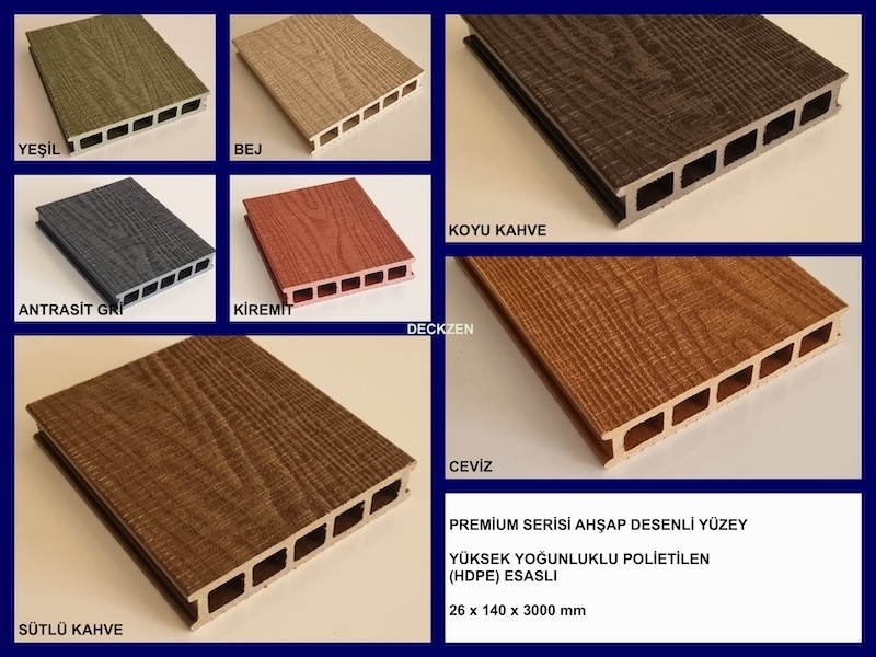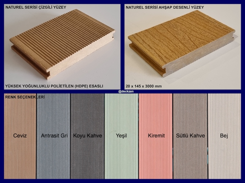 Ahşap Görünümlü Kompozit Deck Kaplamalar iki yüzeyi farklı desene sahip, kaymaz ve antibakteriyel özelliğe sahiptirler.